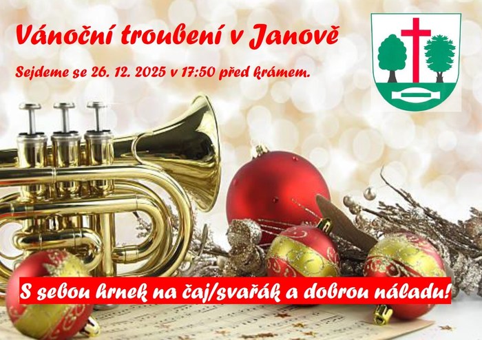 Zveme všechny občany na VÁNOČNÍ TROUBENÍ v Janově dne 26.12. v 17:50 před obchodem v Janově. Přineste si sebou hrnky na čaj/svařák a dobrou náladu